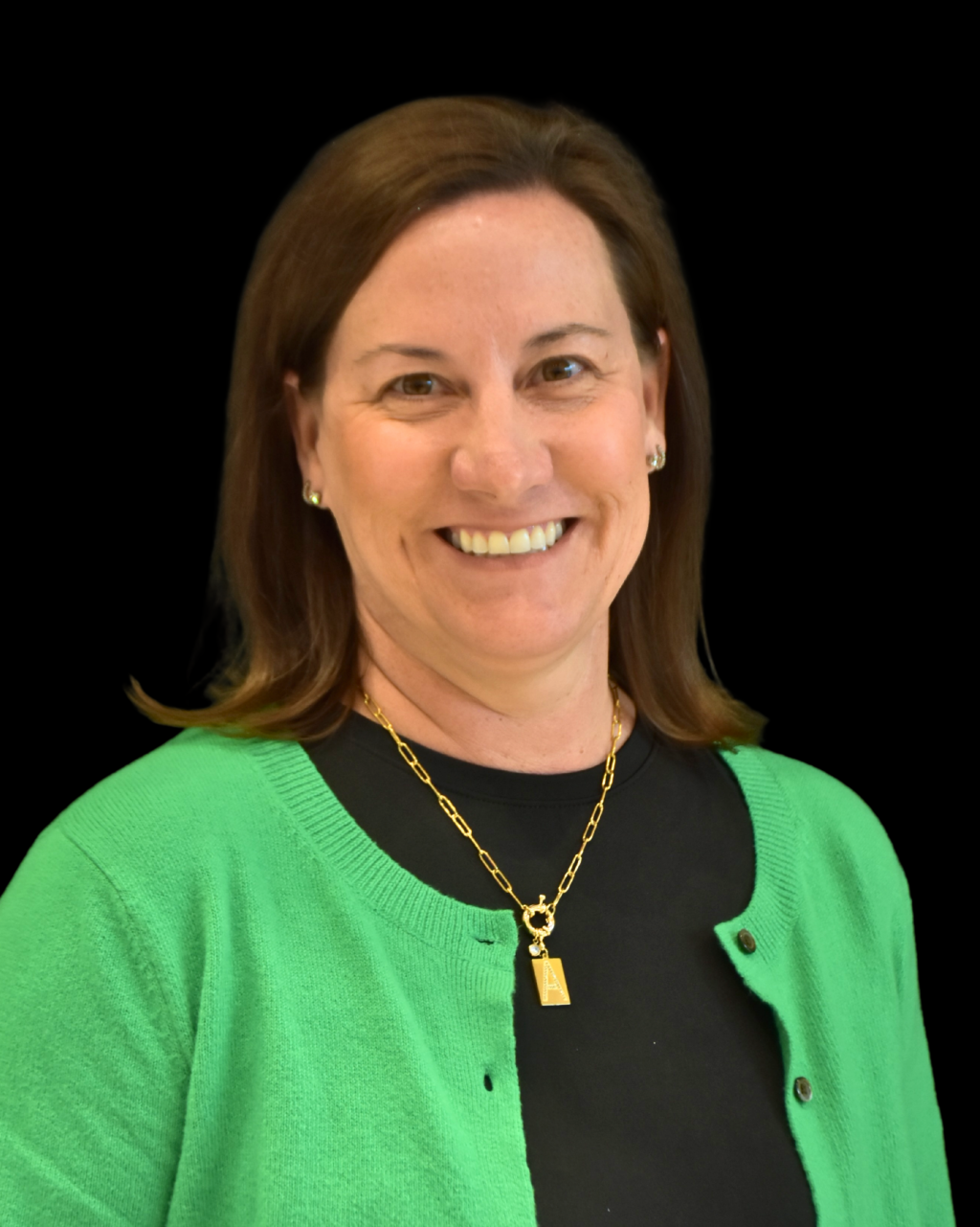 A woman with brown hair smiles, wearing a green cardigan and gold necklace.